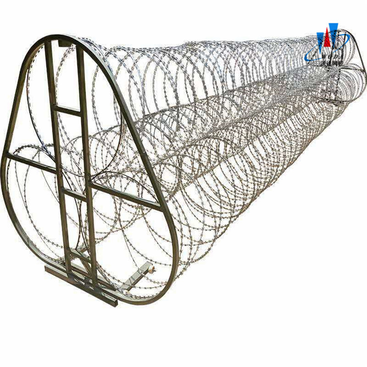 10米刺絲滾籠阻隔網(wǎng)整體重量在70kg左右,為了方便阻隔網(wǎng)的布防及回收,底部設(shè)有萬向輪可隨意行走。