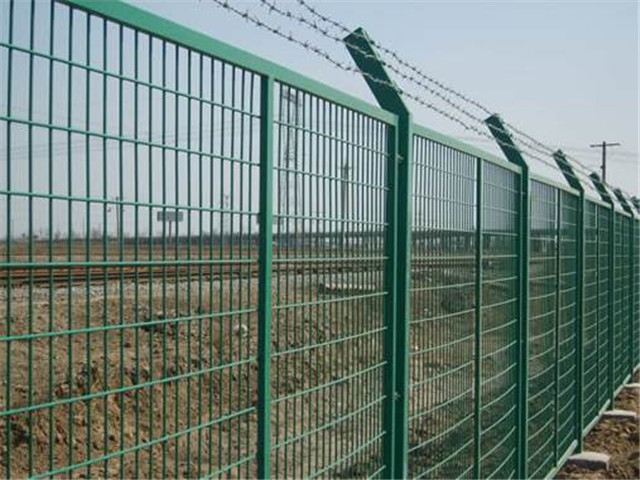 鐵路線路上采購防護柵欄是要保證安全,所以對防護柵欄要求較高。鐵路線路上使用的柵欄類型也不太一樣,根據使用的位置,鐵路防護柵欄的強度也都有區別。鐵路防護柵欄的類型大致分為:雙邊絲護欄,直框護欄,頂部30°折彎的護欄。一般鐵路線路兩側為了阻止落石或者阻擋外界的任何動物的時候會選擇雙邊絲護欄網作為隔離網。鐵路鐵軌兩側會使用直框護欄或者加折彎的護欄作為防護網。但是作為鐵路防護柵欄的護欄邊框不能使用普通的20*30的小邊框,而是采購30*40的方管邊框作為護欄網的邊框與低碳鋼絲焊接?;蛘呤且凿摪寰W作為網片,四周焊接角鐵,也被稱為框架型的鐵路防護柵欄。安裝尺寸:1.8米*3米,柱中到柱中,鐵路線路上常采用水泥立柱與網片連接。邊框:30*40mm,或者40*40的角鐵。表面處理:浸塑草綠色或者浸塑墨綠色。